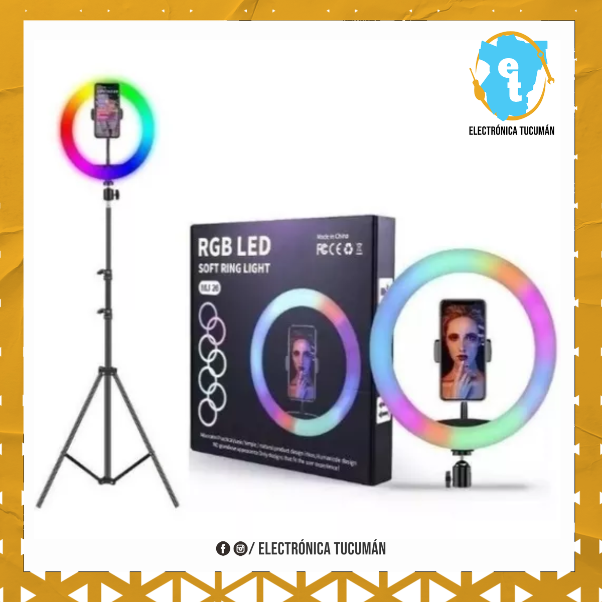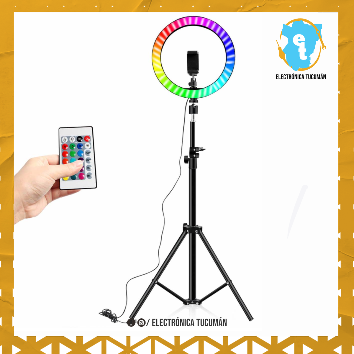 * Diámetro: 26cm * Color de temperatura: 3000K - 5500K - RGB * Lumen: 1200W * Alimentación: 10W • Conexión USB - Puede usarse con adaptador de celular siempre y cuando tenga al menos 3A/3000mA de Salida/Output * Material: PVC * Largo del cable: 1,5 metros * Trípode de 2 METROS Se entrega: 1 x Aro de Luz LED RGB 1 x Soporte para teléfono 1 x Trípode de 2metros