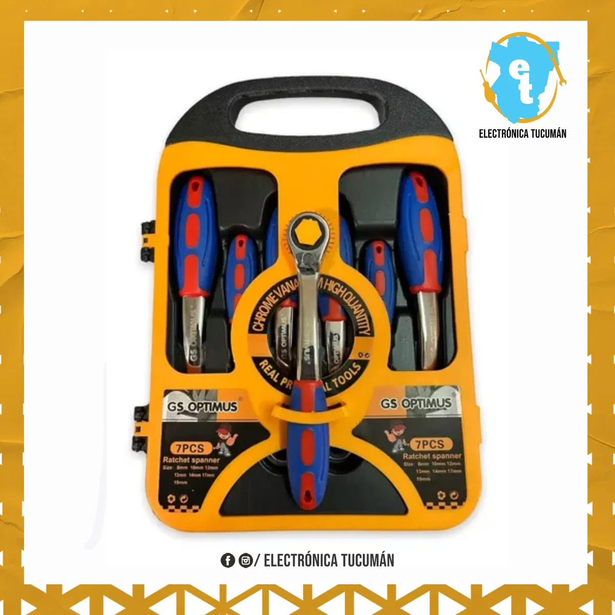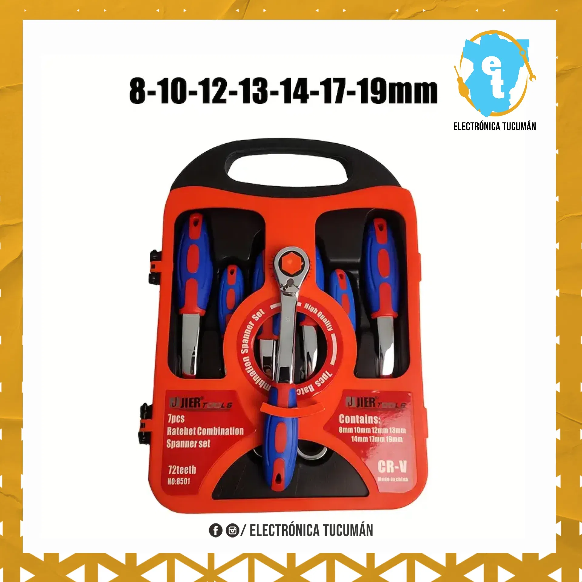 SET DE 7 LLAVES COMBINADAS CON CRIQUET 8 - 19mm: * INCLUYE Estuche Contenedor Plástico. * Manivela tipo Criquet. * Palanca Inversora de Giro. * Mango Anti-Deslizante Recubierto en Goma. * Medidas: 8mm - 10mm - 12mm - 13mm - 14mm - 17mm - 19mm. Las imágenes son ilustrativas, el producto puede tener variaciones dependiendo del distribuidor/marca sin afectar las funciones y calidad del mismo.