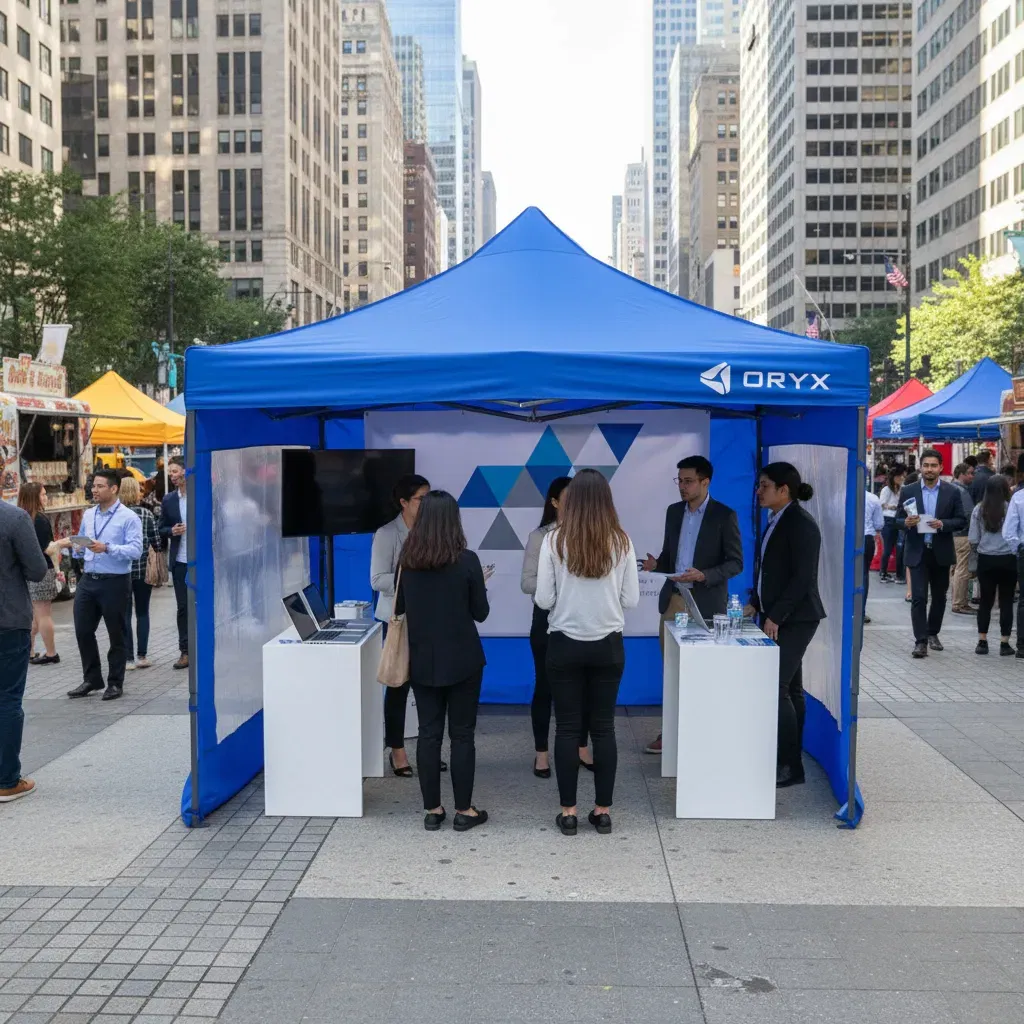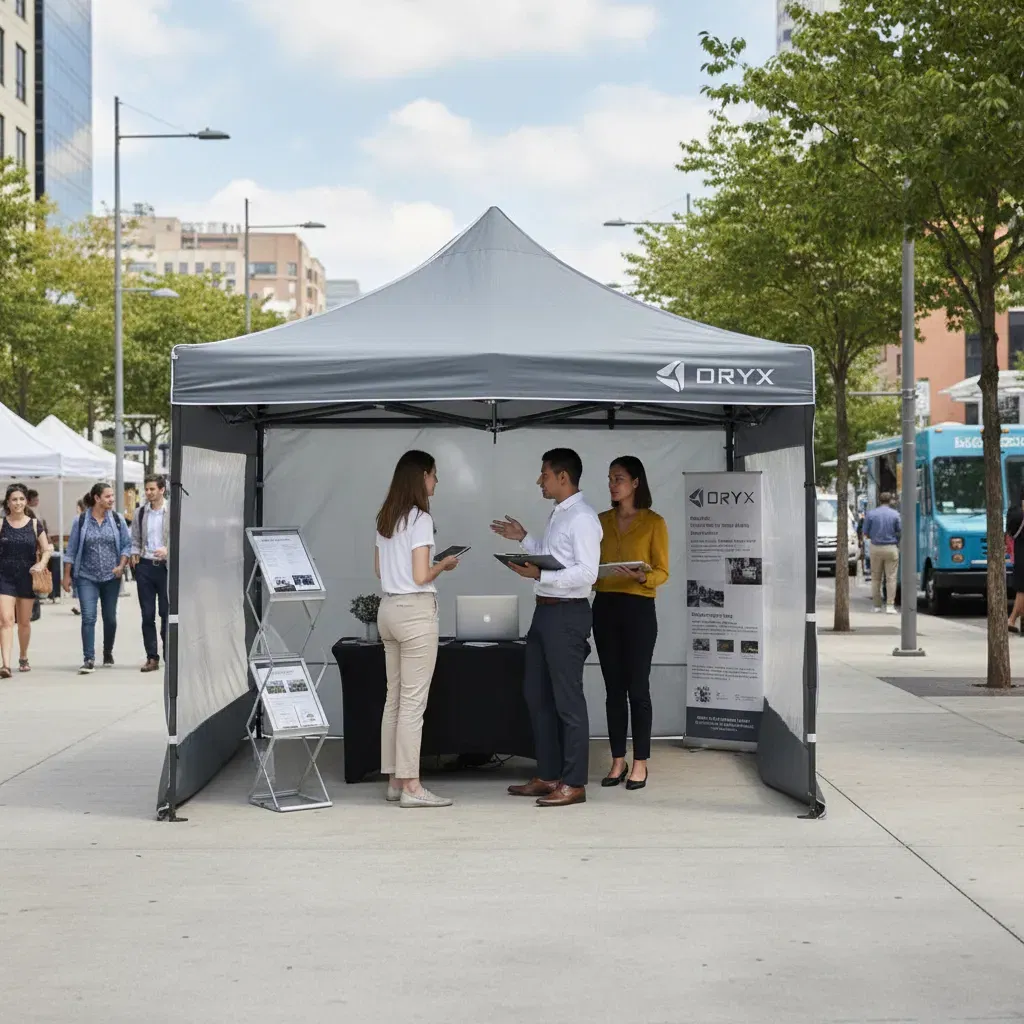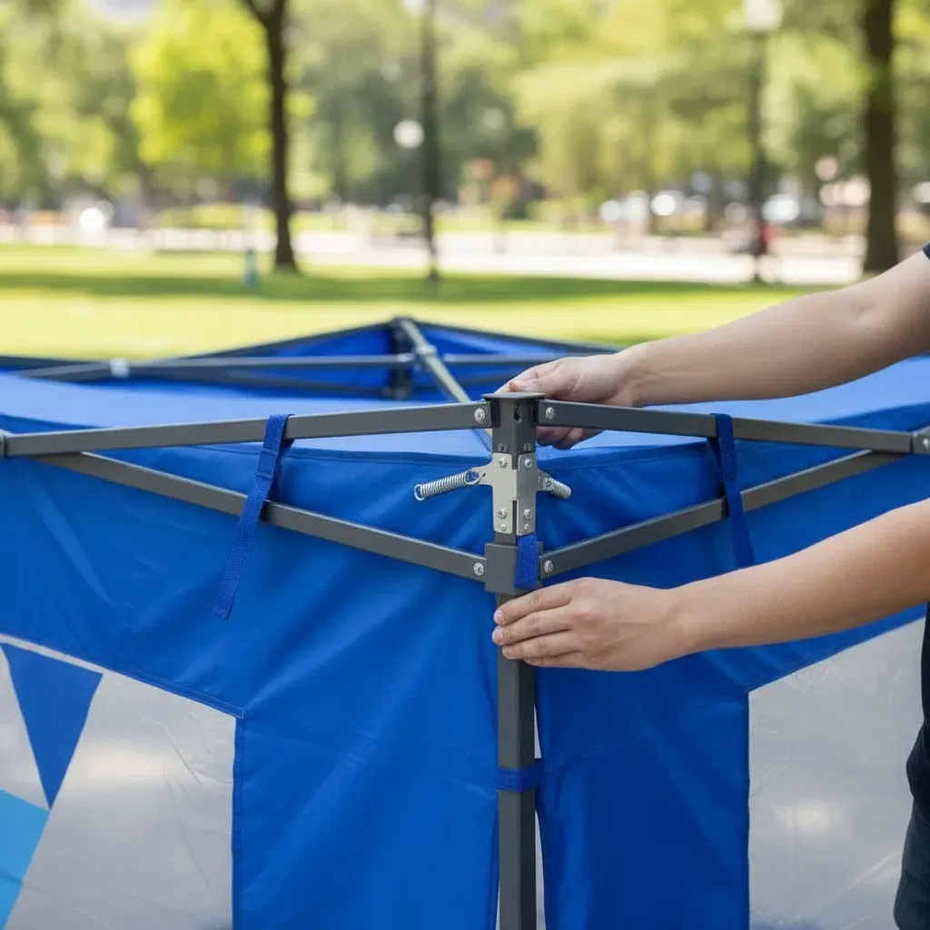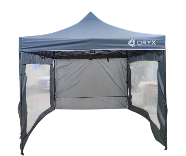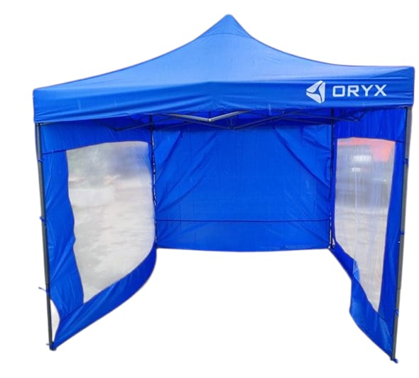 Gazebo plegable impermeable con estructura reforzada y paredes laterales con ventanas transparentes, ideal para brindar cobertura y resguardo en exteriores.