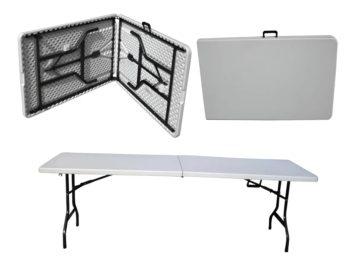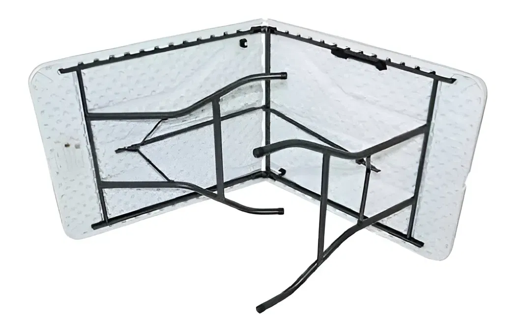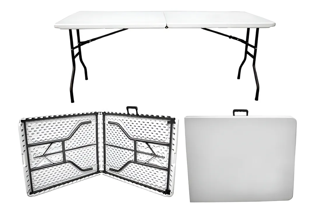 Mesa plegable tipo valija de PVC y patas de caño de hierro muy resistente y robusta.