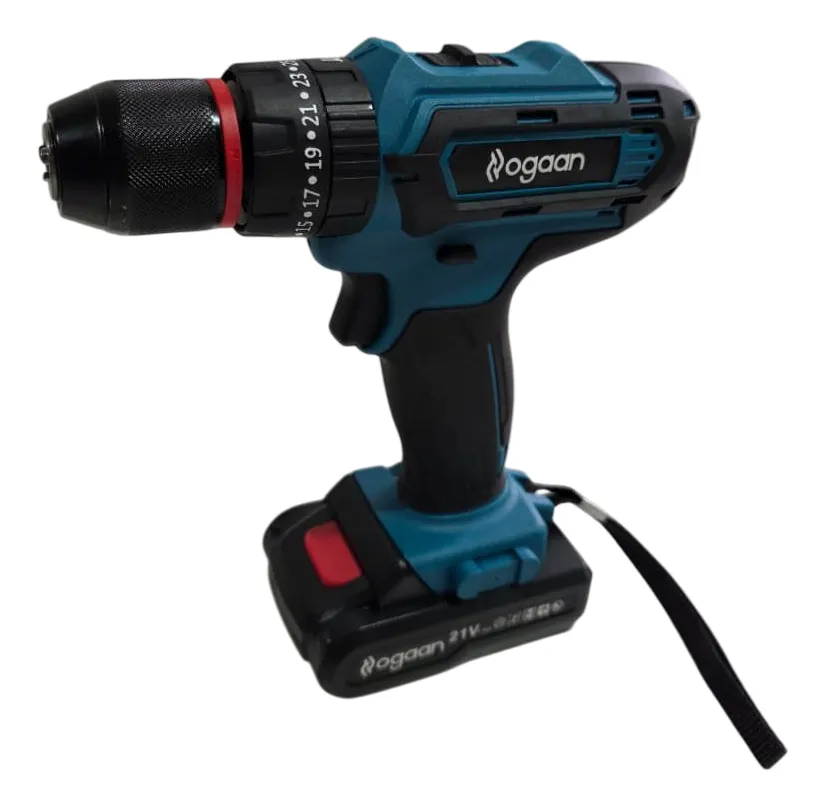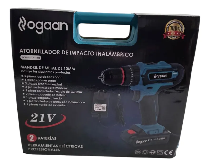 Taladro Atornillador y Percutor Ogaan 10 mm Detalle: - Mandril de Acero - 2 velocidades 0 a 350 y 1300rpm - Ajuste de par: 25 + Continua (taladro) - Luz led integrada para mejor visibilidad - Diseño liviano y compacto. Incluye: - 2 Baterías 21v 1500mAh - 1 Cargador Accesorios: - 6 Mechas - 6 Puntas para Atornillar - 9 Tubos hexagonales - 1 Punta adaptador a encastre 1/4" - 1 Porta punta - 1 Extensor de Punta Flexible para lugares difíciles Velocidad variable: el gatillo ajustable ofrece 2 velocidades (0-350 y 1300 rpm), y el botón lateral permite atornillar y desatornillar. La batería de iones de litio de 21v 1500mah, incluso una de repuesto, ofrece una potencia fuerte y efectiva. Portabrocas autoajustable de 10 mm y luz LED: gracias al portabrocas autoajustable de 10 mm es posible reemplazar las distintas puntas de forma rápida y sencilla sin el uso de llaves; la luz LED también le permite trabajar en entornos oscuros. Seguridad del producto: Este producto está sujeto a instrucciones y advertencias específicas de seguridad.
