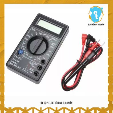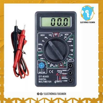 Tester Multimetro Digital 830D Compacto con buzzer HFE 10A MULTIMETRO CON BUZZER DT830D Características: Display LCD numérico de 3 ½ dígitos Rango manual Rangos voltaje DC: 200 mV, 2 V, 20 V, 200 V, 1000 V Rangos voltaje AC: 200 V, 750 V Rangos corriente DC: 2 mA, 20 mA, 200 mA, 10 A Rangos resistencia: 200 O, 2 kO, 20 kO, 200 kO, 2 MO Probador de diodos (ó junturas de semiconductores) Probador de continuidad con indicación audible Medidor de hFE de transistores bipolares. Rango: 0 a 1000 Inyector de señal cuadrada, 50 Hz, 3 Vpp aprox. Indicación de sobre rango Batería de 9 V (no incluida) Protección contra sobrecorriente mediante fusible de 250 mA (Rango de 10 A no protegido) Tamaño: 2.5 cm x 6.8 cm x 12.4 cm aprox. Incluye: 1 Multímetro 2 puntas de prueba 1 Manual