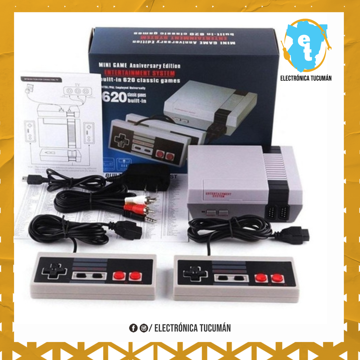 •Consola de juegos con 620 juegos clásicos integrados en 8 bit •Tiene un diseño clásico a la NES, con controles universales de 9 Pin, •110V-220V, 50-60 Hz. •Incluye: Consola, Controles, Cable AV, Cable de poder, manual de uso Esta máquina de juego no solo te permite experimentar el nuevo juego con los últimos equipos, sino que también te recuerda los dulces recuerdos de los viejos juegos. 100 PCT nuevos y de alta calidad. 620 juegos clásicos incorporados. Toda la acción tiene lugar en una pantalla, desde una perspectiva en tercera persona alejada. Fácil de controlar Devolviéndote muchos recuerdos de juego cariñosos. Con 2 controladores de juegos, plug and play, adecuado para familias, amigos, parejas, etc. No necesita otras tarjetas de juego y descargar, con sistema de entretenimiento. ESPECIFICACIONES Tipo de artículo: consola de juegos clásica Game Console: para 8 bits, no es compatible con tarjetas de juegos Juegos: juegos de video integrados de televisión infantil 620 Sistema de señal de TV: NTSC / PAL Estado del televisor: A.V. Fuente de alimentación: AC 110-220V Salida DC 6V-150mA Controlador: controlador con cable doble Material: ABS Compatible con: NES Número de Sesión de Juegos: 620 Idioma: Inglés