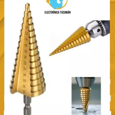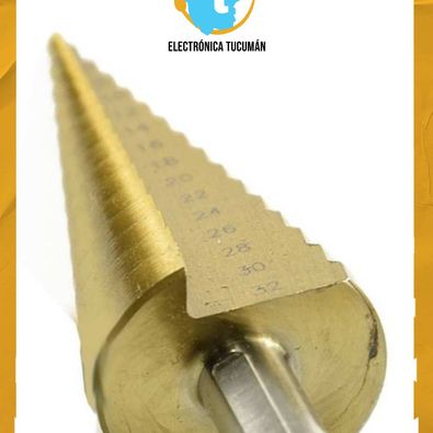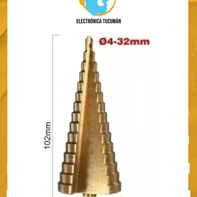 MECHA ESCALONADA CON BAÑO DE TITANIO 4 A 32 MM. CARACTERÍSTICAS GENERALES – Medidas: 4, 6, 8, 10, 12, 14, 16, 18 20, 22, 24 ,26, 28, 30, 32 mm. – Para utilizar en : chapa, metales, plástico . ( Hasta 1mm ) INCLUYE Una mecha escalonada con baño de titanio de 4 a 32 mm.