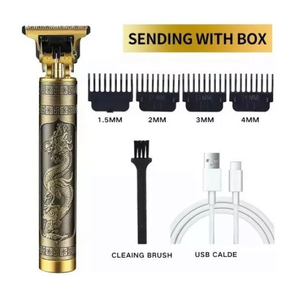 RASURADORA CORTADORA DE PELO, PATILLAS, BARBA RECARGABLE // Nueva rasuradora estilo vintage, apta tanto para rasurar patillas y barba como para realizar delicados cortes y diseños en el cabello rasurado. Incluye todos los accesorios necesarios para un kit que puede ir desde amateur hasta profesional, además de tener un bello diseño de dragón labrado en dorado. << ESPECIFICACIONES TÉCNICAS >> • Potencia: 5W • Voltaje: 5V • Batería recargable de li-ion 18650 de gran capacidad: 1200mAh (incluye cargador con indicador lumínico) • Tiempo de carga: 2 horas • Tiempo de uso por carga: 2 horas • La cuchillas posee cabeza redondeada, y pequeños dientes de 0.45 a 0.8mm • Posee unas cuchillas tan finas que pueden usarse hasta en las pieles mas delicadas, como para rasurar bebes • Incluye 4 cuchillas intercambiables de: - 1,5 mm - 2 mm - 3 mm - 4 mm << ACCESORIOS INCLUIDOS >> • 4 cuchillas intercambiables • Cargador de batería con indicador lumínico • Cepillo de limpieza • Aceite lubricante de cuchillas SE DEBE DAR UNA CARGA PREVIA ANTES DE USARSE