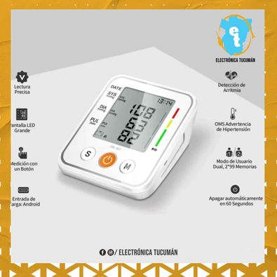 Acerca de este producto Gran Pantalla LCD: el tensiómetro de brazo está equipado con una pantalla digital LCD de cristal líquido. Los resultados de la presión arterial, el pulso, la detección de arritmias y el nivel de presión arterial de la OMS se muestran muy claramente en la pantalla, lo que es conveniente para que las personas lean la presión arterial y el ritmo cardíaco, especialmente para los ancianos Modo de usuario dual: el tensiómetro permite a 2 personas usarlo simultáneamente, registrando 2 X 99 resultados y también puede mostrar la lectura promedio de los últimos 3 medición. Con la función de memoria automática, es conveniente que los usuarios recuperen datos para compararlos Advertencia de OMS presión arterial: hay una barra de advertencia de OMS presión arterial en el lado derecho de la pantalla. Después de la medición, se muestra una línea negra corta a la izquierda, que corresponde a 3 tipos de advertencia: la parte roja es de alta presión, el amarillo es una advertencia temprana y el verde es normal Fácil de usar: mida solo con un clic. Puede saber la salud de su corazón al medir la presión arterial. Con la función de notificación de error, lo facilita a los usuarios encontrar la causa del error. Se apagará automáticamente después de 1 minuto sin operación, lo hace más fácil de usar Hermoso Diseño: el host está hecho de materiales ecológicos, y es pequeño, hermoso y ergonómico. El brazalete es de un material suave con una longitud de 22-42 cm lo que lo hace más cómodo cuando lo usa Características del producto: La medición automática de la presión arterial y la frecuencia cardíaca con un solo botón puede acortar en gran medida el tiempo de medición y obtener datos de medición más precisos. Con un cable de carga USB y una conveniente interfaz de carga USB, se puede cargar fácilmente en cualquier momento y en cualquier lugar. Modo de combinación de usuario dual, cada grupo almacena hasta 99 valores de medición, puede compartir este dispositivo con su familia o pareja. Pantalla LED y función de memoria, puede leer los valores medidos claramente en la pantalla, lo que es muy adecuado para la autocomprobación por parte de personas de mediana edad y personas mayores. Función de notificación de error, puede comprender los cambios en la presión arterial con mayor claridad, función de apagado automático, después de 1 minuto de inactividad, se apagará automáticamente, ahorrando energía, uso ecológico. Tensiómetro Parametros del producto: Rango de presión: 5.3kPa-37.3kPa (40 mmHg-280 mmHg) Precisión de presión: ± 3 mmHg / ± 0.4 kPa Precisión de pulso: ± 5% Rango de pulso: 40-199 veces / min. Tamaño del puño: 22-42 cm MODO DE USO Con respecto a la presión arterial, necesita saber: Antes de tomar la medición, mantenga la calma y relájese durante al menos 10 minutos. Evite comer, beber, fumar, hacer ejercicio y bañarse, y la inestabilidad emocional. La presión arterial medida puede cambiar en diferentes momentos del día. Método de uso correcto: Cuando esté en uso, la salida traqueal debe estar en el centro del brazo, la banda de presión arterial que se va a medir debe envolverse alrededor del brazo, y el borde del manguito debe ser 1- 2cm del codo. Método de medida: Se recomienda utilizar la medición de la postura sentada, mantener el cuerpo recto y la espalda recta, colocar las palmas de las manos sobre la mesa y extender los brazos de forma natural. El manguito debe mantenerse al mismo nivel que el corazón. Presione el botón de encendido para tomar la medida. Cómo obtener lecturas más precisas: Tenga cuidado de no doblar el tubo de presión arterial. Luego tome la medida en un estado relajado. No se mueva ni hable durante la medición, se recomienda medir al menos tres veces para que la lectura promedio se acerque más a su condición física