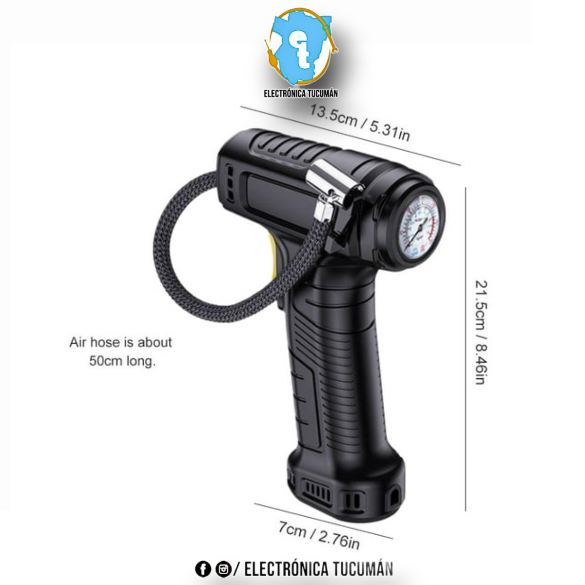 Al ser portátil, podrás trasladarlo fácilmente. Presión máxima de 250psi. Potencia del motor de 150W. Pesa 1.19kg. Posee un caudal de aire de 30l/min. Es apto para autos. Largo de la manguera de 1m. Accesorios incluidos: 3 picos adaptadores. Potencia tus herramientas neumáticas y facilita múltiples tareas manuales.